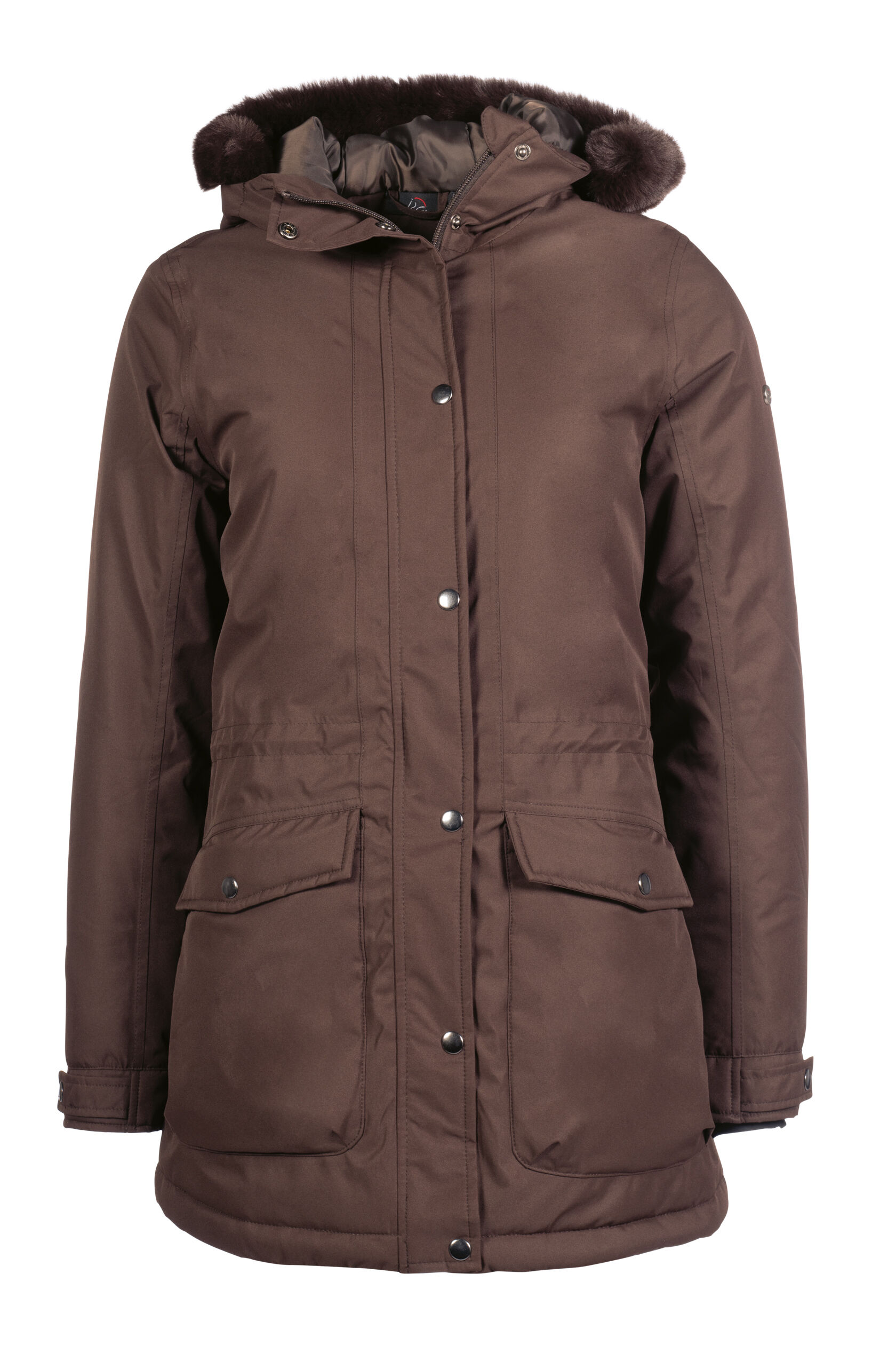 Tailliert geschnittener Parka. Der Mantel hat einen Taillengummizug. Zudem sind Reitschlitze eingearbeitet, die durch Druckknöpfe geschlossen werden können. Der Reitmantel ist wasserdicht und atmungsaktiv, die Nähte sind getapt. Der Fellkragen aus Kunstfell ist mit Druckknöpfen an dem Kragen des Parkas befestigt und kann abgenommen werden. Die beiden Front-Taschen des Mantels können mit Druckknöpfen verschlossen werden. Der 2-Wege Reißverschluss des Parkas ist in der Farbe des Parkas gehalten. Er wird von einer Deckleiste verdeckt, die mit Druckknöpfen geschlossen werden kann.